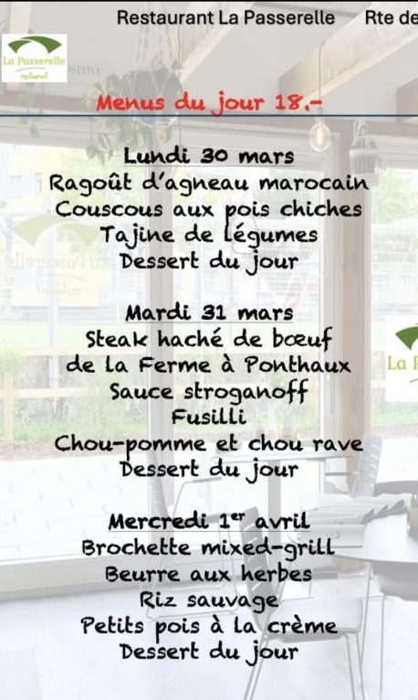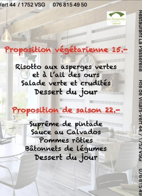 Conçu, réalisé et géré par les classes de préformation professionnelle du Centre scolaire de Villars-Vert, le restaurant La Passerelle est ouvert lundi, mardi et mercredi pour le service de midi. Il est fermé durant les vacances et congés scolaires.